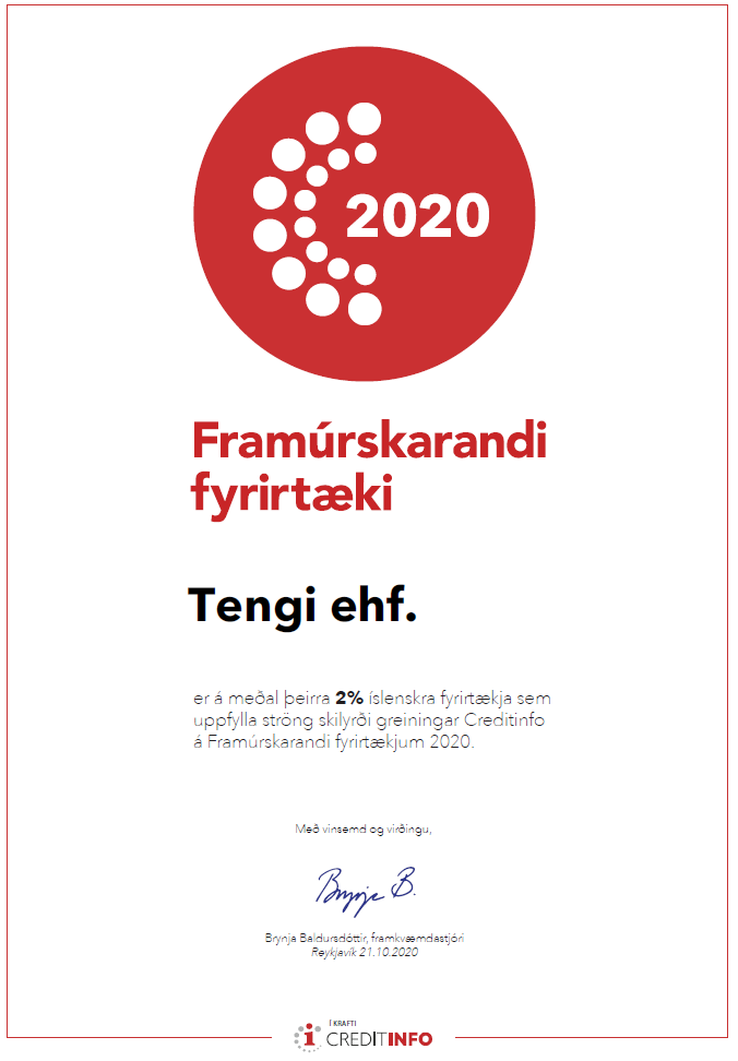 Þau ánægjulegu tíðindi voru að berast að Tengi sé eitt af framúrskarandi fyrirtækjum Creditinfo árið 2020. Viðurkenningin byggir á rekstri fyrirtækja 2019 ásamt fleiri atriðum eins og vera með lánshæfiseinkunn í flokki 1-3 af 10 mögulegum. Tengi er þar með bestu einkunn eða í 1. flokki.