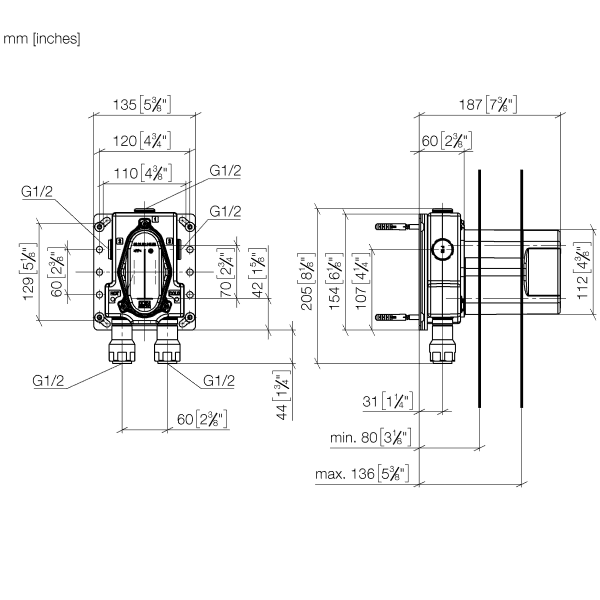 Innbyggður hluti sturtutækis frá Dornbracht. Tækið er 1/2″