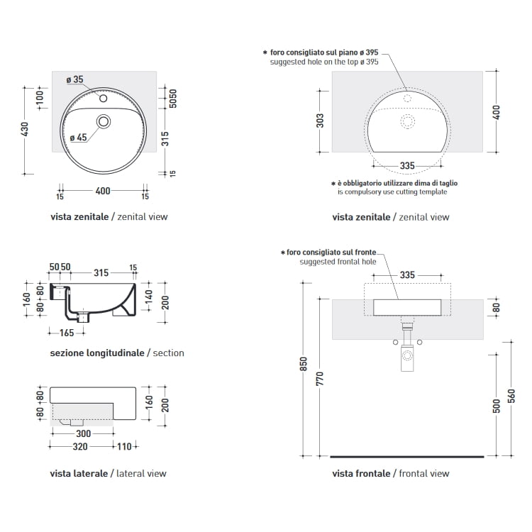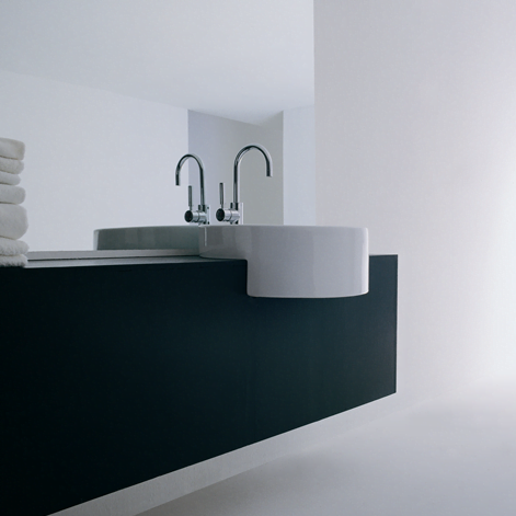Twinset borðhandlaug hálf fram af plötu með gati fyrir blöndunartæki. frá Flaminia42cm
