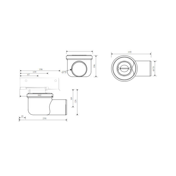 Niðurfall lárétt með vatnlás í horn 75mm frá Unidrain