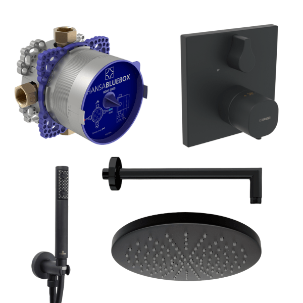 Innbyggður matt svartur sturtupakki með öllu sem þarf fyrir góða sturtu