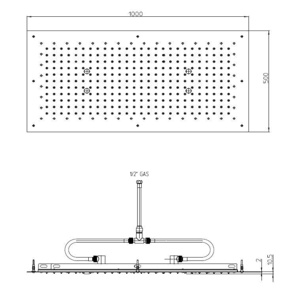 Innbyggður sturtuhaus með lýsingu. Stærð 1000mm x 500mm, frá Bossini. Krómaður.