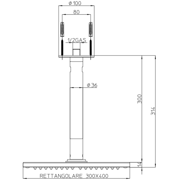 Ferkantaður sturtuhaus með stöng úr lofti, frá Bossini. Stærð 400mm x 300mm. Krómaður